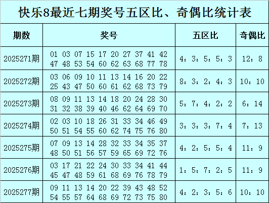 福彩快乐8第2025277期开奖回顾:09 11 13 14 20 22 39 43 48 52 54 55 57 64 68 69 72 73 75 80,其中奖号五区比为4:2:3:5:6,奇偶比为10:10,012路比为8:7:5。