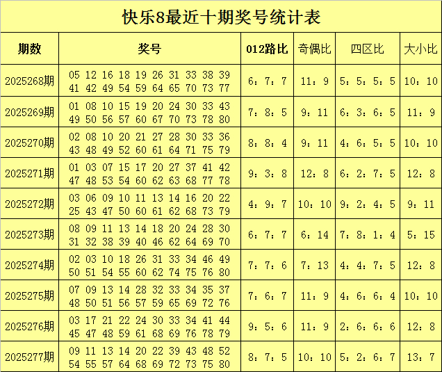 福彩快乐8第2025277期开奖回顾:09 11 13 14 20 22 39 43 48 52 54 55 57 64 68 69 72 73 75 80,其中奖号012路比为8:7:5,四区比为5:2:6:7奇偶比为10:10,大小比为13:7。