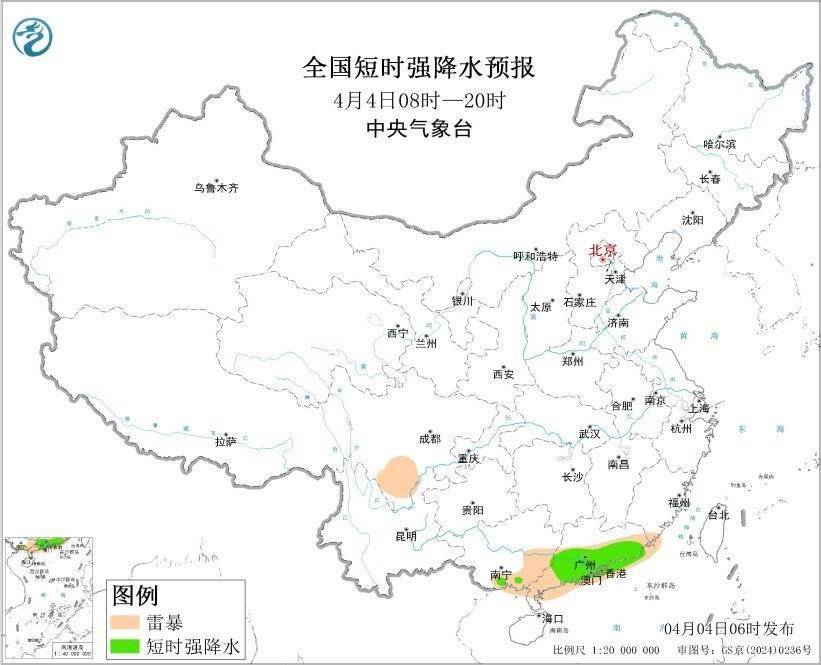 r预计4月4日08时至5日08时,重庆中南部、贵州东北部、广东中南部和西部等地的部分地区将有短时强降水天气,小时雨量20-40毫米,局地可达50毫米以上;另外,重庆西部、贵州北部、广东中西部等地的局地将有雷暴大风或冰雹天气。