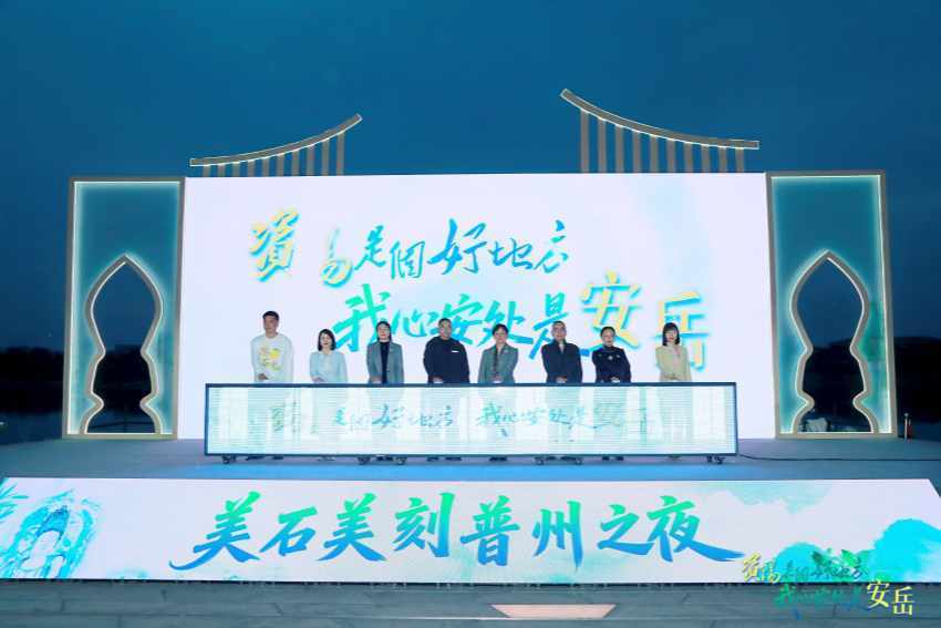 晚风轻拂,石窟千年。活动尾声,安岳文旅推介官廖玉霞、艺术家苏茂隆、国家级非遗传承人石永恩共同登台,向全场发出诚挚邀约,“安岳永远欢迎您。”